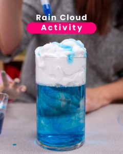 Fill the jar ¾ full with water. Add shaving cream on top of the water (this is your “cloud”), then drop food colouring on top and watch the “rain” fall.