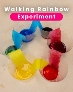Fill alternating cups with coloured water (blue, yellow, red) and connect them using folded paper towels. Watch as the colours “walk” and mix together to form orange, green and purple.